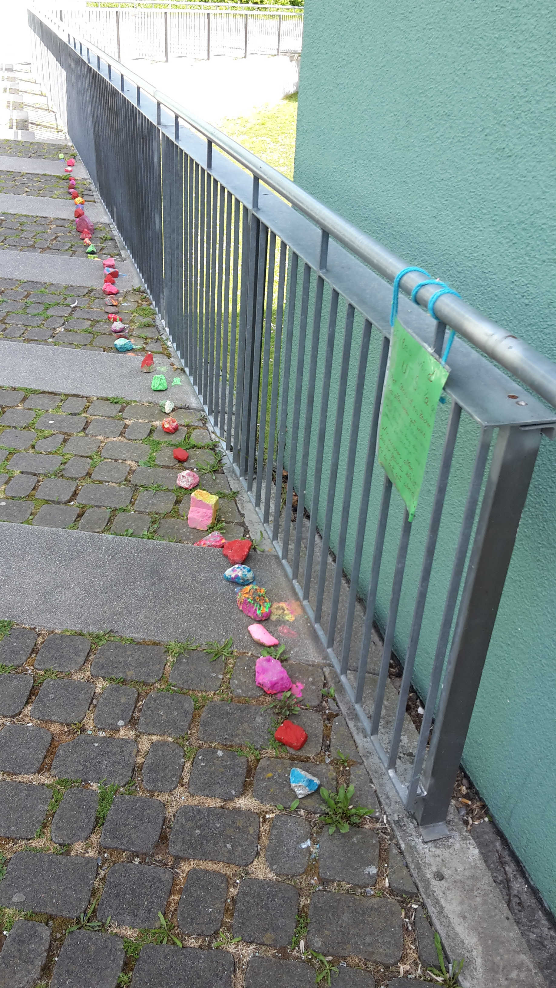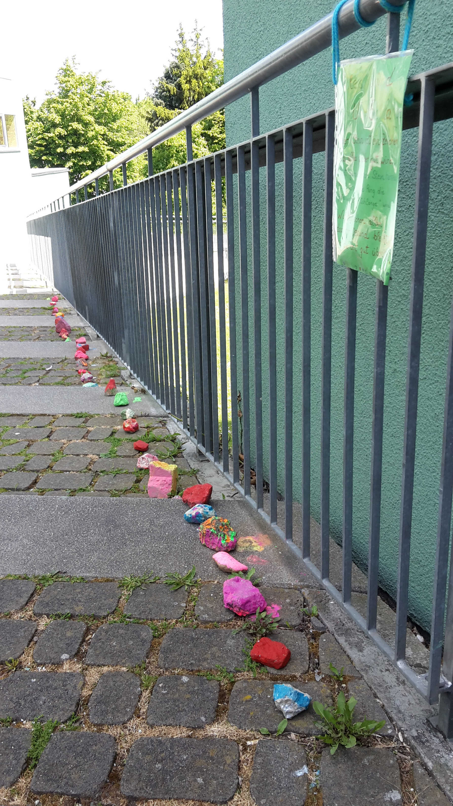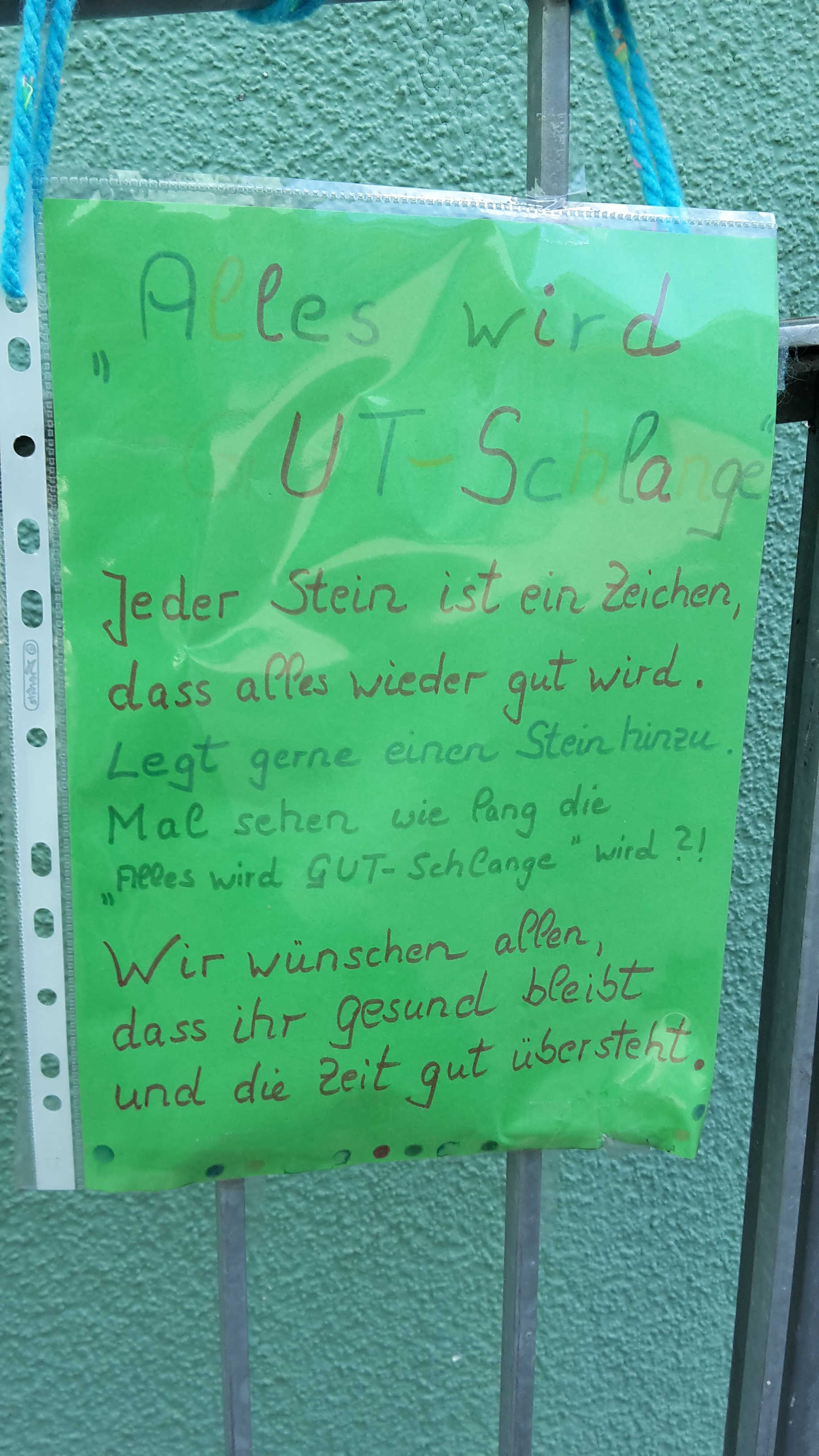 Auf unserem Schulhof wächst eine bunte Steinschlage. Jeder Stein stellt ein Zeichen dar, dass alles wieder gut wird. Die SchülerInnen haben während der Betreuungszeit viele Steine bunt angemalt, daraus ist bereits eine lange "Alles-wird-GUT-Schlange" entstanden. Aber sie kann noch länger werden! Legt gerne einen bunten Stein hinzu! Wir wünschen uns allen, dass wir uns alle bald gesund und munter wiedersehen können.